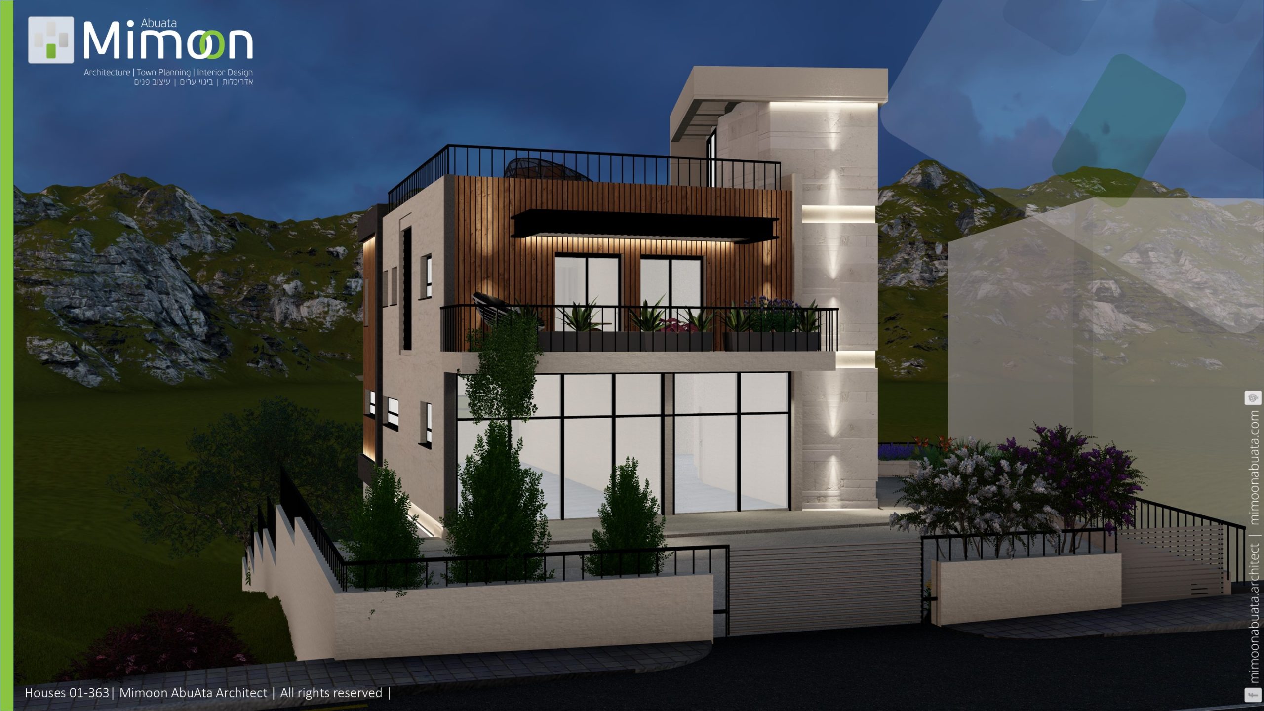 وصف المشروع: مسكن مكون من ثلاث طوابق مع شقتين جنبًا إلى جنب، يقع في جبال وادي عارة ويطل على منظر رائع. تم التركيز بشكل خاص على الخصوصية وتكيف المبنى مع الموقع.
